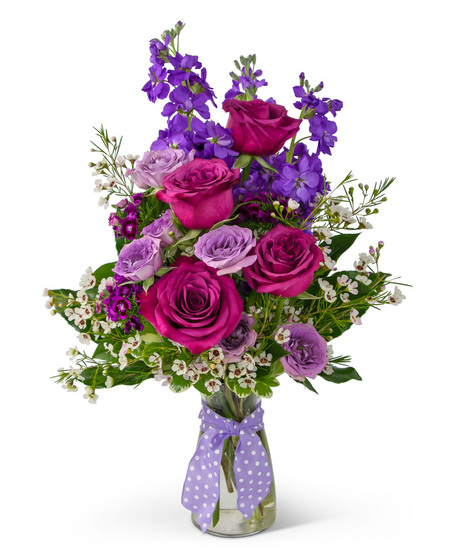 There is just something majestic about A Queen's Beauty. Just like a true queen, this bouquet blends both grace and strength in its royal hues of purple. Just above a purple ribbon, blooms abound. Richly colored roses, sweet William, waxflower, and more!