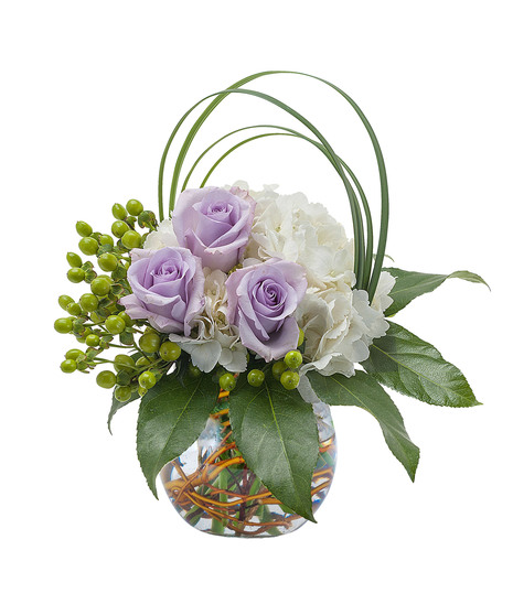 Bubbly and fun. Bree uses flowers like white hydrangea and lavender roses in a playful bubble bowl.