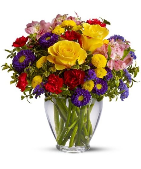 With an abundant array of bright red, yellow and purple flowers, this arrangement is sure to brighten your day. Roses, alstroemeria, asters, carnations and chrysanthemums are delivered in a cheerful clear glass vase. Approximately 15 1/2" W x 15 1/2" H