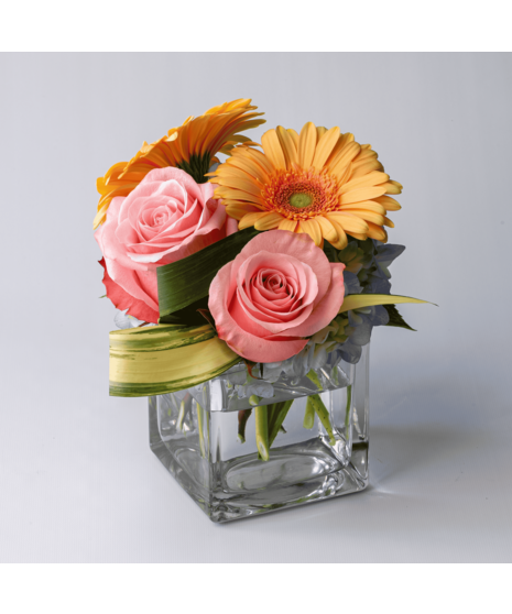 Subtle and sophisticated. Cheerful Whisper is a quiet expression of love. Flowers like roses and hydrangea are artistically arranged in this adorable cube.