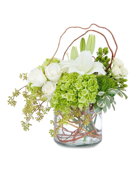 A naturally styled combination of lilies, roses and hydrangea in a clear vase accented with Curly willow to make this simply styled design.