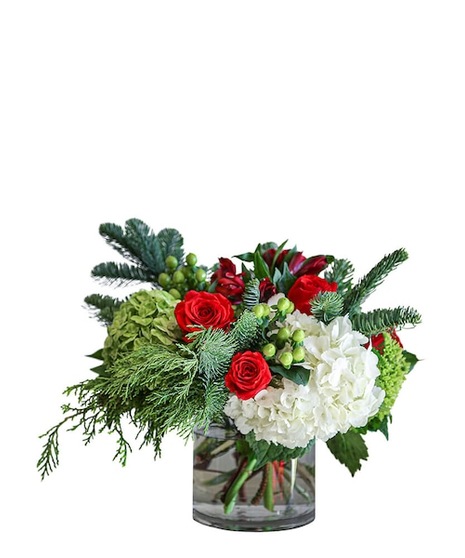 Cindy Lou will melt the hearts of everyone. Flowers like white hydrangea and roses are adorned with seasonal greens in this festive beauty.