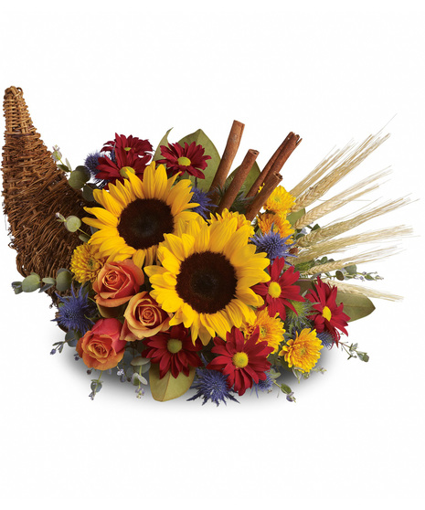 Gorgeous sunflowers and lush orange roses are accented with unique blue eryngium, red daisies, yellow cushion mums, parvifolia eucalyptus and magnolia leaves in a wicker cornucopia-shaped basket.