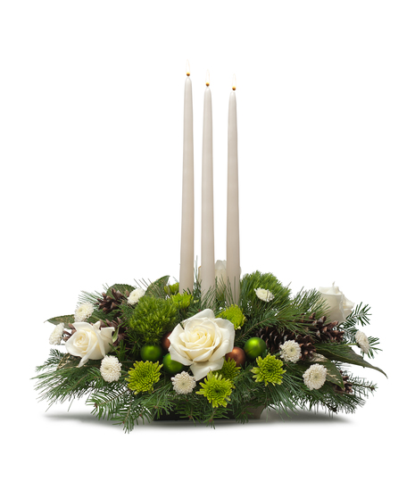 This traditional winter white candle centerpiece will add a warm glow to any table setting.