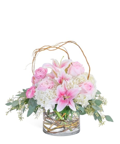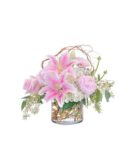 This is a perfect design to enhance any home or office space, and will certainly make a statement! Curly willow encircles this combination of hydrangea, roses, lilies, and ranunculus to draw attention to the premium delicate blooms sitting in a clear glass cylinder.