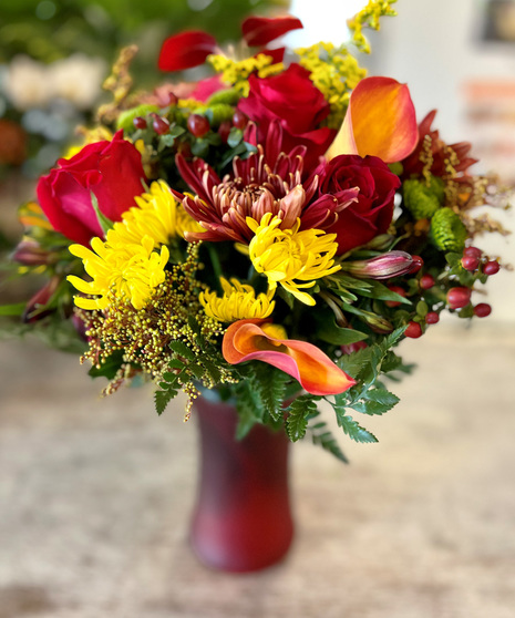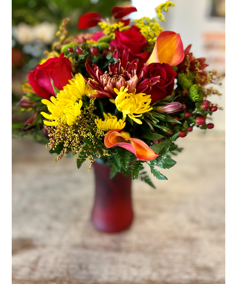 Get cozy with Fall Stunning. This arrangement gives an unique and colorful floral design using autumn colors. The Chrysanthemums, yellow solidago, and marble yellow/orange Calla lily truly makes this arrangement stand out in any home. enjoy these flowers in our many fall color tall cylinder vases.