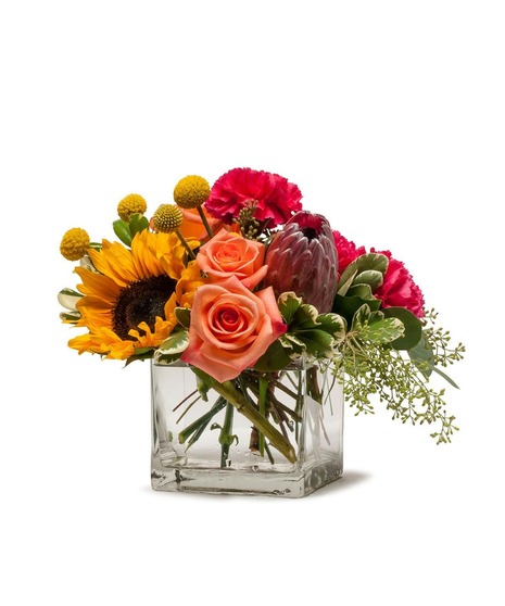Who can feel down when a Sunflower is around? Send a fun floral combination of colors and textures in a clear glass cube to a special someone on your mind. Flower Fun is a perfect flower gift for any occasion or to put a little summer sunshine into your life.