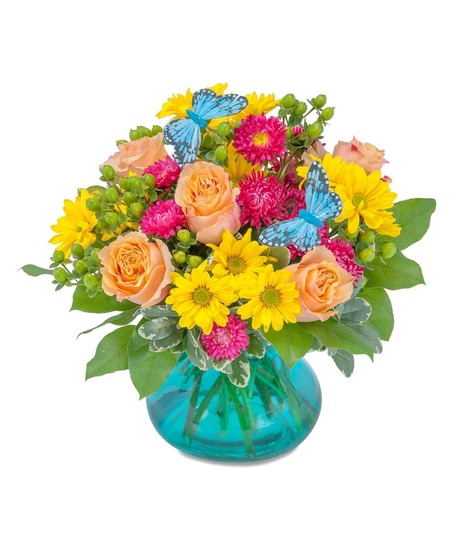 This bright, cheerful combination of yellow and white daisy chrysanthemums, roses and berries in the fun and festive vase is sure to brighten a day. The fluttering butterfly is the perfect touch!