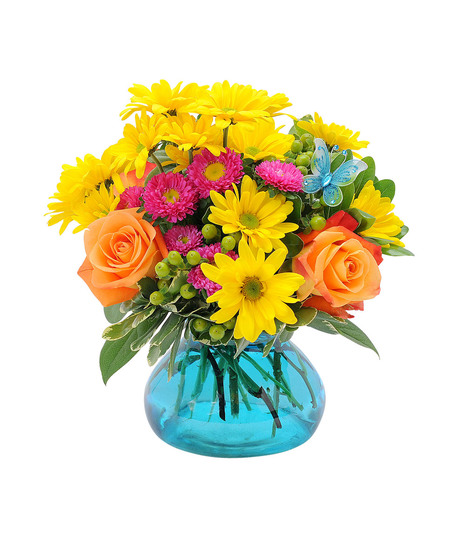 A bright, cheerful combination of daisies, roses and berries, accented with a butterfly.