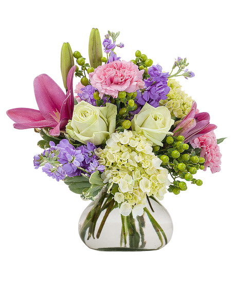 A walk in the garden. Garden Villa uses a beautiful combination of pink, lavender and green blooms in a rosie posie vase.