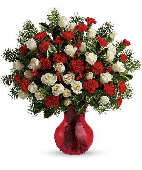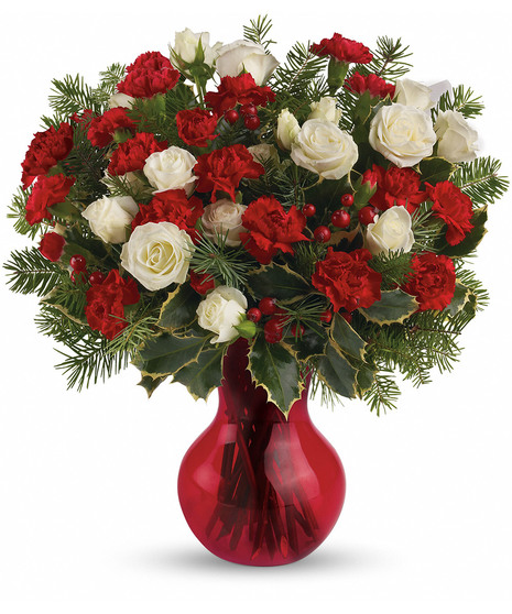 Featuring a wondrous assortment of white spray roses and red miniature carnations, this sweet arrangement is presented in our red Serendipity vase.