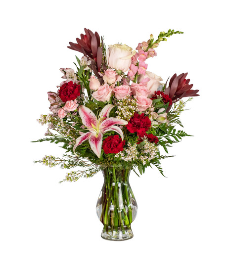 Who doesn't like the colors at dusk? Gazing at Dusk is reminiscent of a romantic evening walk on quiet paths. Flowers like roses, spray roses, alstroemeria, and carnations, fill our bella vase with a mix of hues.