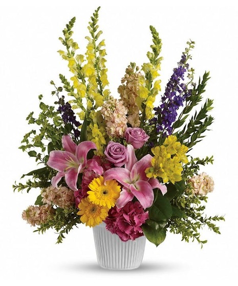 After the memorial service and the family returns home, they will be deeply touched to find this exquisite arrangement of pink hydrangea, lavender roses, pink lilies and other favorites waiting for them. It will say what words cannot.
