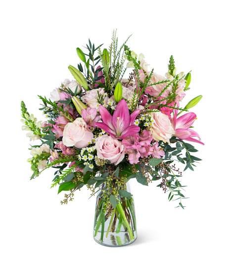 Pink Snapdragons and Alstroemeria set the backdrop, like a field full of wildflowers, for Soft Pink Roses and Asiatic Lilies that shoot out like rays of light over a fresh spring meadow. It all sounds a little glorious, doesn't it? Whether you are celebrating a birthday, welcoming a new baby, or saying "happy anniversary!" you can't go wrong with this arrangement.
