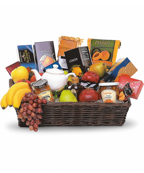 When you want to send your thoughts wonderfully, send this basket filled with fresh fruit, biscuits, and tea. Nothing's grander.