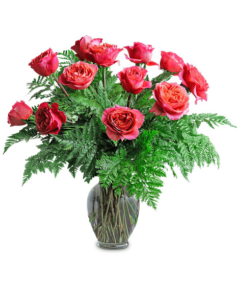 Dark coral garden roses are tastefully arranged in a Jordan vase.