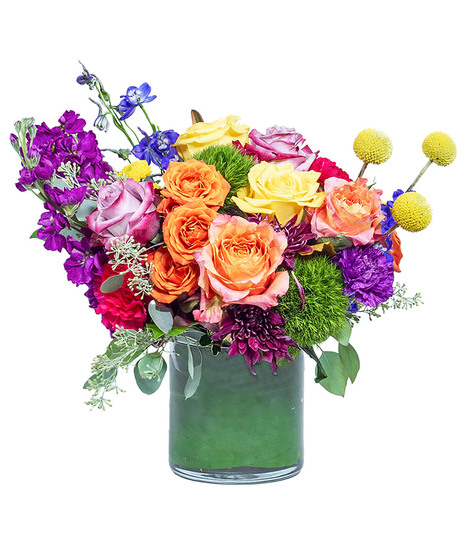 Grab your dancing shoes! Happy Dance will make you want to don your dancing shoes and take the floor. A clear cylinder vase is filled with fun roses, carnations, and mums to greet the recipient.