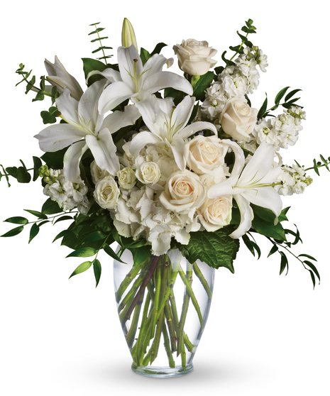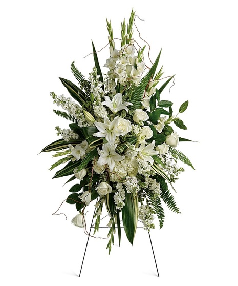 This beautiful spray includes white hydrangea, white roses, white oriental lilies, white gladioli, white stock, pitta negra, sword fern, curly willow, variegated aspidistra leaves, and lemon leaf. Delivered on a wire easel.