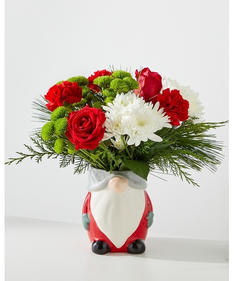 Gnomes are jollier than ever this holiday season. This novelty ceramic vase arrives overflowing with red carnations, holiday greenery, and red roses for an adorable delight.