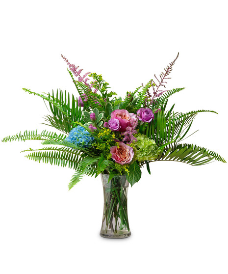A sweet melody of spring blooms in green, blue, yellow, lavender and pink with seasonal Florida foliage like sword fern, coontie and pittosporum designed in a flared clear glass vase appropriate for an entry table or kitchen island.