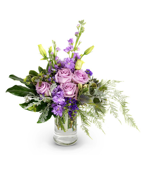 Does life feel a little hectic? The Inner Harmony arrangement brings peace to any space with its relaxing tones and pleasant fragrance. Roses, Stock and Statice in shades of purple, are accented by Blue Thistle and premium foliage.