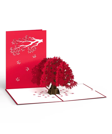 Once opened, a delicately crafted red Japanese Maple Tree is revealed in all its glory. At the trunk of the tree, the card is embellished with laser-cut maple leaves.