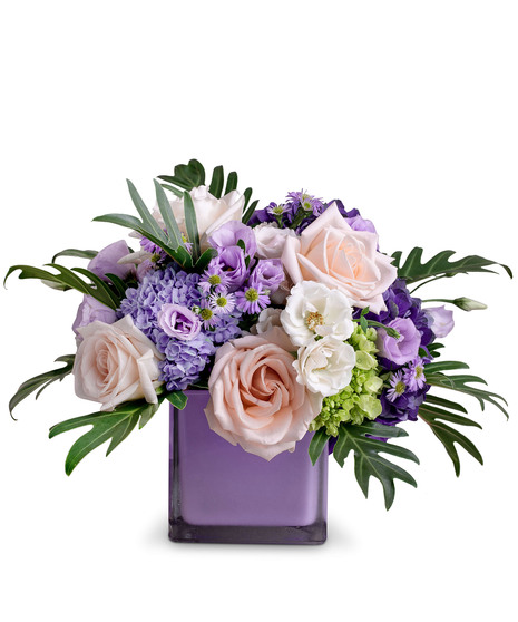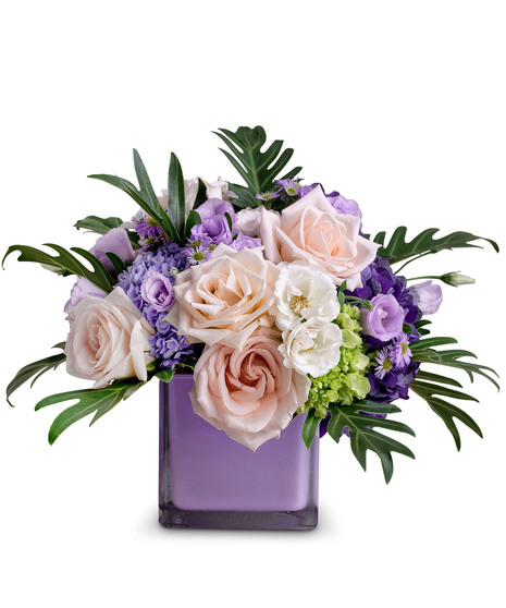A charming combination of peaches, lavender and hints of green with festive Florida foliage like xanadu designed in a lavender glass cube appropriate for a coffee table.