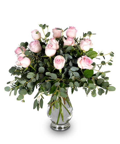 She's your uptown girl. Luxurious will add that special touch when you say "I love you!'. Our Bella vase is accented with pink roses and Eucalyptus for a high society statement of you love.