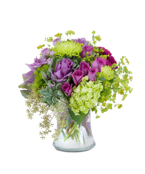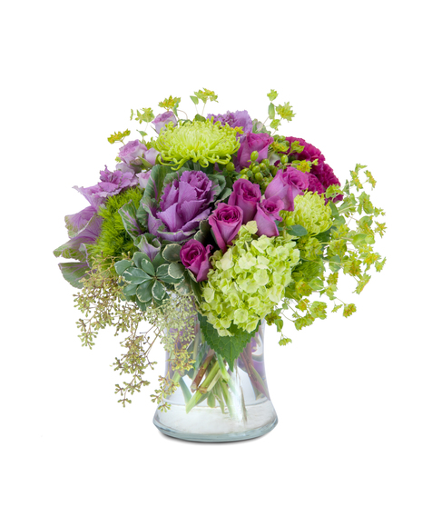 A magical mixture of magenta and green flowers, including roses, hydrangea, hypericum berry and ornamental kale, designed in a large clear glass vase.