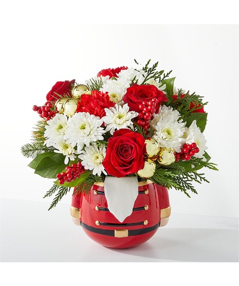 Share in the nostalgia of the season with a collectable nutcracker vase perfectly accented with holiday blooms.