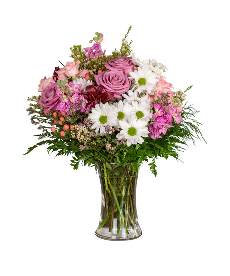 There is magic in the air. Mystic Mauve will brighten the room with flowers such as spray roses, daisies, lilies, and stock gathered for this surprising display.