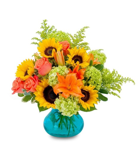 Sending this bright color combination of fresh flowers is like sending wishes for an Outstanding Day! Brighten your space with this cheerful floral arrangement featuring vibrant sunflowers, orange lilies, and coral roses, complemented by lush green hydrangeas and foliage. Housed in a striking turquoise glass vase, this bouquet radiates warmth and joy, making it perfect for celebrations, special occasions, or simply to uplift your home decor. The bold colors and lively composition create a stunning centerpiece that brings a touch of sunshine indoors.