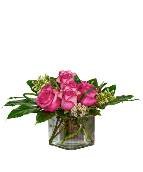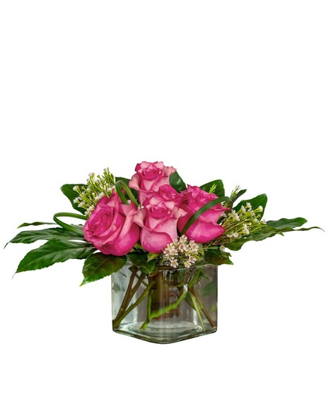 Sleek and stylish. Passionate Pink sends a special message of affection. Flowers like hot pink roses are tastefully arranged in this cube will accent any space.