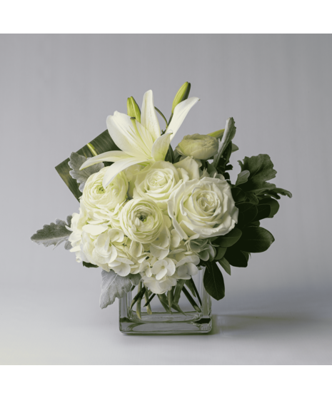 Cultured beauty. Pearl is an exquisite expression of love. Flowers like Roses, Hydrangea, and Lilies are mixed with fun greens in this cube.
