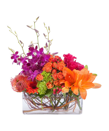 Groupings of premium blooms in a clear glass container combine to make this modern design.