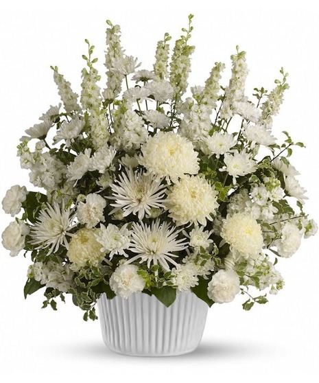 This magnificent bouquet of classic all-white flowers in a graceful Grecian urn is an eloquent expression of sympathy. For the service or for the home, it is a lovely way to let the family know that you are thinking of them.