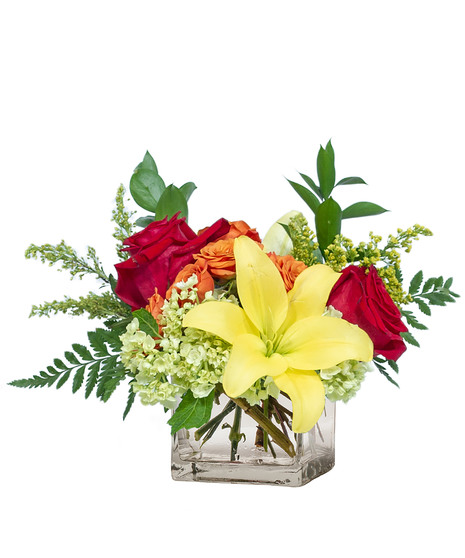 Honey, you rule! Queen Bee says you are here to fix the crowns of others. A clear cube features a Yellow Asiatic lily with support from roses and a green mini hydrangea.