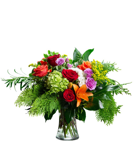 She will be delighted. Romantic is the perfect expression of love. Roses, lilies, and hydrangeas adorn our clear glass vase.