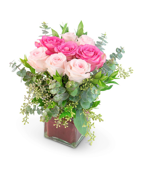 Strike the spark of love by sending your romantic partner this all-around full flower arrangement, Rose Romance. With pink roses, a red ti leaf, eucalyptus, seeded eucalyptus, and myrtle professionally hand-arranged in a red cube vase, this flowery gift of cheer and love makes the perfect celebratory arrangement or any-day arrangement!