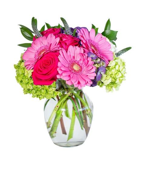 You want to make them blush. Rosey Cheeks is like sweet secrets whispered in their ears. Hot pink Gerbera Daisies and Roses share the secret in this precious arrangement.