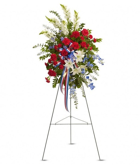 Standing tall, proud and patriotic, this dazzling free-standing spray is like a fireworks display made of graceful flowers. Uniquely beautiful, it's a lovely way to honor a great loss.