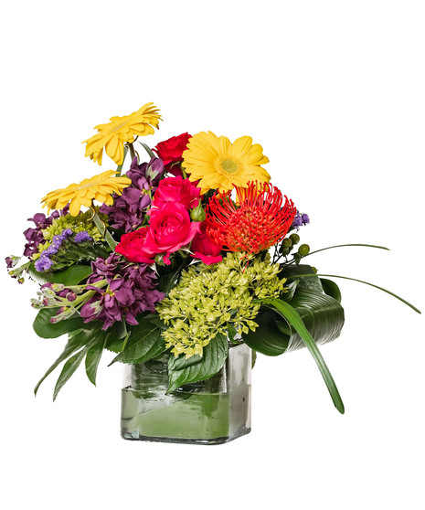 Let beauty awaken your senses. Siesta Sunrise's colorful pallet and sweet smells will have their hearts dancing. Yellow gerbera, Purple Stock, Orange Pincushion Protea and Pink Spray Roses adorn this compact cube design.