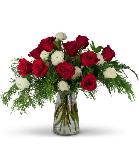 Having a cup of hot cocoa with a friend, Christmas Eve at home with the family, stories being passed down from generation to generation. Some things are just better when you are settled Snug by the Fire. This lavish arrangement features 12 Red Roses and 12 White Roses in a beautiful holiday arrangement.
