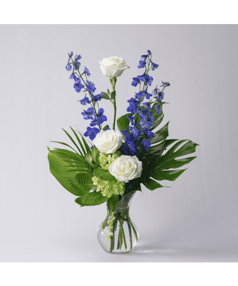 Calm and soothing. Speak To Me will speak to their heart. Flowers like roses and delphinium are tastefully accented with fun greens in our sweetheart vase.