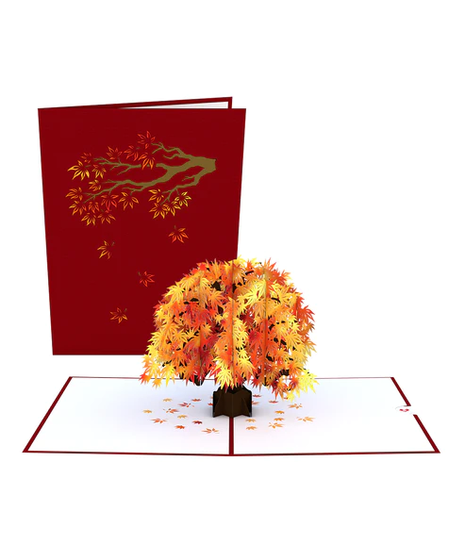 The cover of this beautiful pop-up card is red and adorned with an illustration of the branch of a Maple Tree just starting to shed its leaves. Once opened, an intricate Sugar Maple Tree is pops up from the center. As the fall season sets in, the leaves have turned a gorgeous array of yellow and orange. The card's inner panels are embellished with laser-cut maple leaves.
