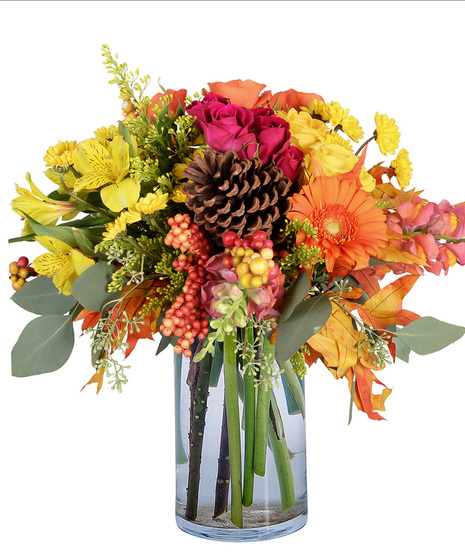 Rekindle your love of fall. Sugar Maple is dressed with autumn colors for a breathtaking arrangement. Chrysanthemums, snapdragons, and yellow solidago, add extra warmth to this clear glass cylinder