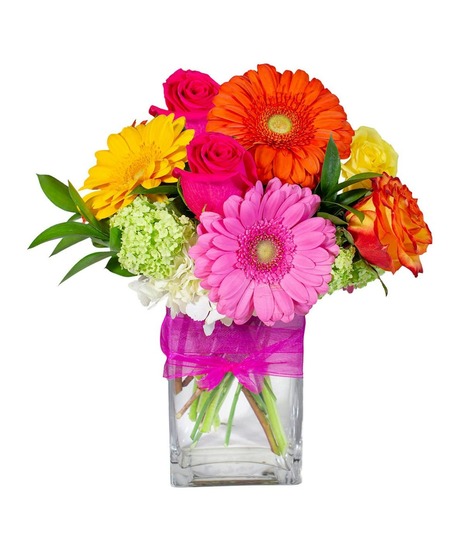 Whimsical and inviting. Warm Welcome is like a hug from a loved one. Roses are paired with Gerbera Daisies and Hydrangeas in this cute cube.