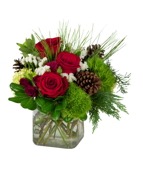 Rich reds and deep greens with a burst of white combine to make this Wintertime Beauty. Pine Cones perfectly accent Roses, Mini Hydrangea, Green Trick Dianthus and a mixture of premium holiday greens in this cheery holiday cube. The Wintertime Beauty arr