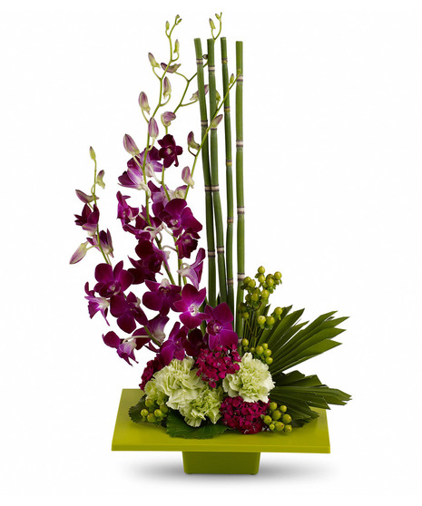 It's artistic arrangements like this one that make flowers such an integral and beautiful ingredient in feng shui. A brilliant green container and exotic palm leaf provide the perfect backdrop for purple orchids and a mix of delightful tropical flowers. This gift takes artistry to new heights.