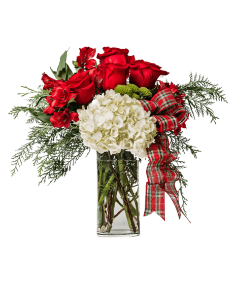 Darling, get ready to adore this one! Bee Merry is sure to create a buzz of joy. Red Alstroemeria and Roses come together with a white Hydrangea and plaid ribbon in this delightfully inspiring design.